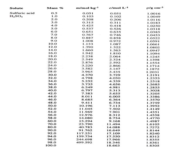 اگر چگالی اسید سولفوریک مورد آزمایش 1.25gr/cm³ باشد و چگالی اسید سولفوریک خالص(98.5%) رو برابر با 1.84gr/cm³ در نظر بگیریم.