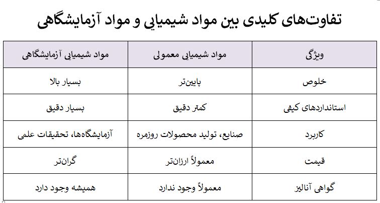- مواد شیمیایی صنعتی معمولاً در حجم بالا و با هزینهی کمتر تولید میشوند و ممکن است ناخالصیهای بیشتری داشته باشن